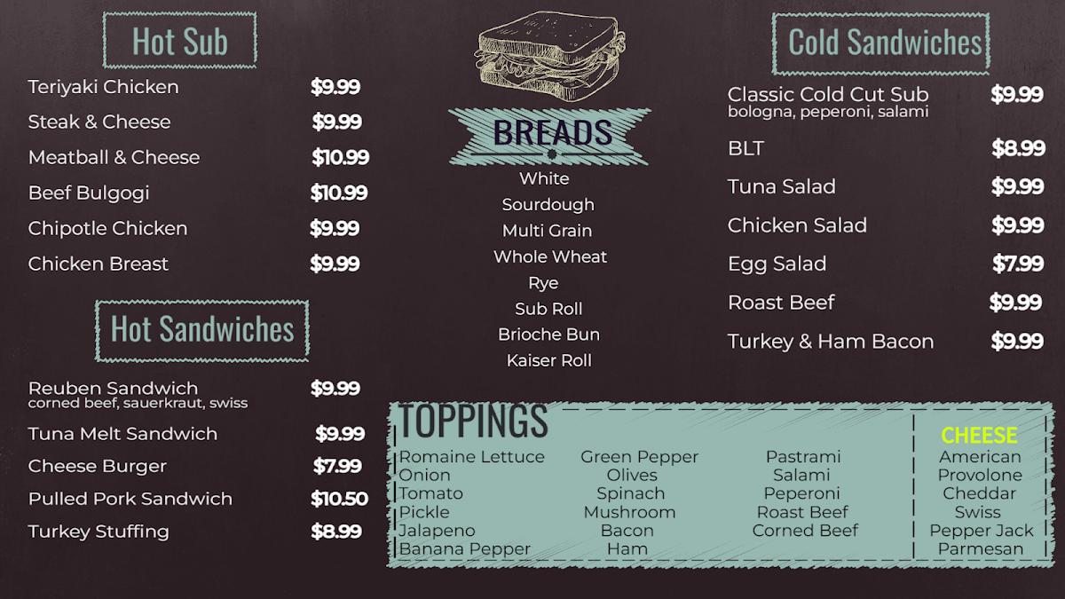 Grilled chicken breast, Teriyaki Sauce, Provolone Cheese, Lettuce, Tomato, and Grilled onion on 8inch Sub roll.